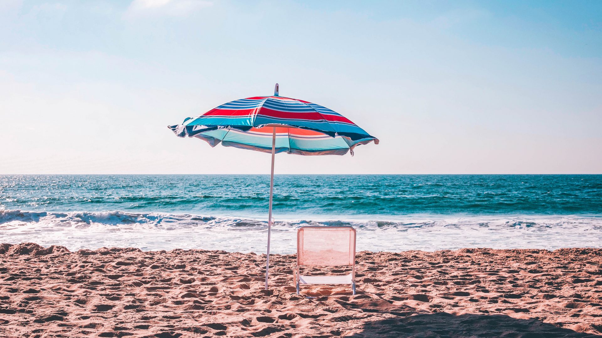 beach with an umbrella and deck chair facing the sea