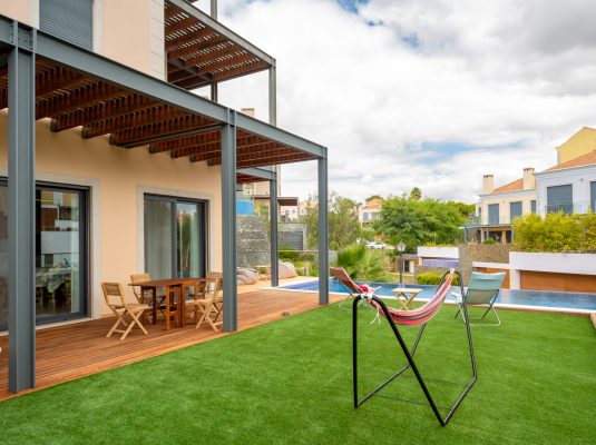 The pool deck has a covered area for outdoor dining, faux grass area and BBQ area.