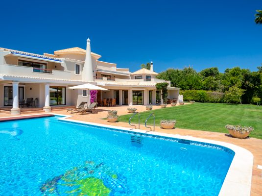 An excellent five bedroom villa with pool and large lawn garden open to the lake & golf course in Quinta do Lago.
